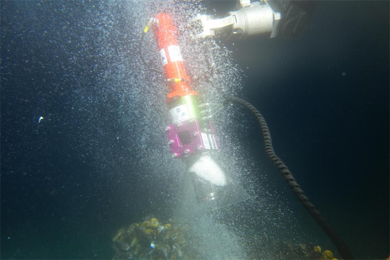 Die Feuerentnahmevorrichtung sammelt brennbares Eis an einer kalten Quelle auf dem Meeresboden, 18. September. (Xinhua/Meeresgeologisches Forschungsinstitut Guangzhou)