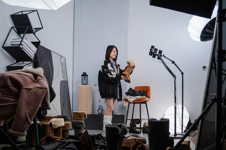 Eine Mitarbeiterin preist Schuhe über Livestream in einem Internettechnologieunternehmen im Bezirk Ouhai in Wenzhou in der ostchinesischen Provinz Zhejiang an. 10. November 2025 (Foto: Liu Jili/Xinhua)